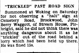 After WW2, Stream House remained as flats until 1954, by which time John and Eleanor Waggott were the only remaining occupants (in Flat 5). They had lived in the flat since c1950, and Eleanor was on the Pirbright WI committee. John hit the local headlines with a serious traffic misdemeanour (shown right). Hard luck, John! The Waggotts then moved to Connaught Road, Brookwood and later, St John’s. Eleanor died in 1962 at the Nuffield Nursing Home in Woking under anaesthetic during an operation, aged 51.