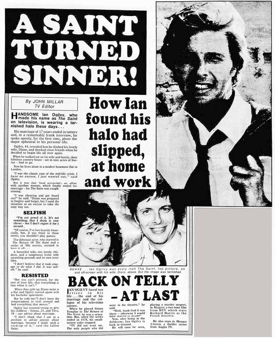 Ian Ogilvy was educated at Eton and chose to enter the acting profession – not surprisingly, given his parents’ backgrounds. In the 1960s he was living with his mother, Aileen, in Kensington. Ian’s acting career took off in 1978, when he played the role of Simon Templar in Return of The Saint. In the original series of The Saint, Roger Moore had played the lead role, so it is not surprising that Ian was considered as a possible replacement for Roger Moore in the role of James Bond in the early 1980s when he (Roger Moore) announced his intention to stand down (which in the event he failed to do).